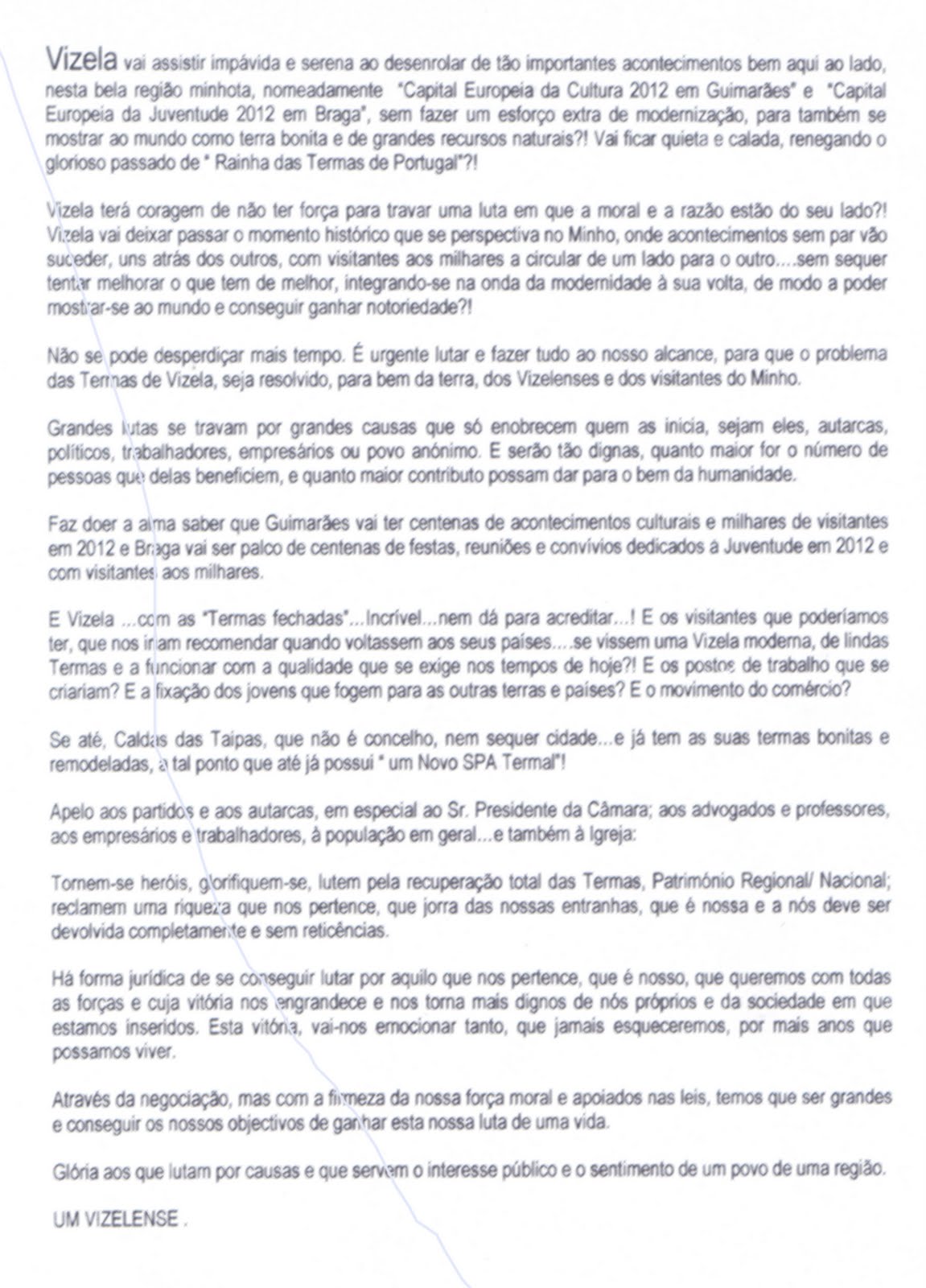 Assinado por UM VIZELENSE (e parece não deixar dúvidas que é um grande vizelense, seja ele quem for), é um grito de alerta de apelo à UNIÃO de todos os vizelenses para que não deixem cair as TERMAS estando Vizela a 10 KM da futura Capital Europeia da Cultura. Clique em cima do manifesto para aumentar o tamanho e se possivém faça-o circular. Vizela precisa de todos.